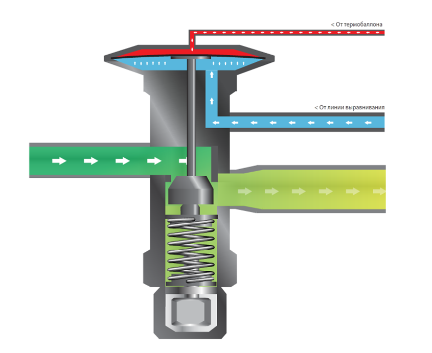 Термобаллон ТРВ устанавливается на линии выхода хладагента из испарителя, где воспринимает на себя температуру выходящего хладагента. В том случае, если давление в термобаллоне (а значит и температура газа на выходе из испарителя) превосходит давление хладагента на значение, определяемое силой пружины, ТРВ открывается и подает хладагент в испаритель. В том случае, если температура газа на выходе снижается, ТРВ ограничивает подачу хладагента в испаритель.