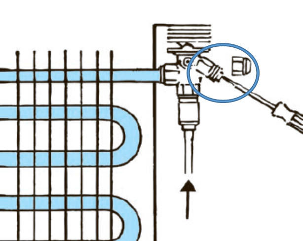В том случае, если значение перегрева отклоняется от номинального, а все иные возможные причины исключены, производится регулировка ТРВ. Настройка ТРВ осуществляется поворотом регулировочного винта.