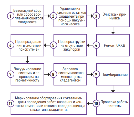 - Техникам-холодильщикам запрещено модифицировать ОХКВ любого типа для использования с воспламеняющимися хладагентами.