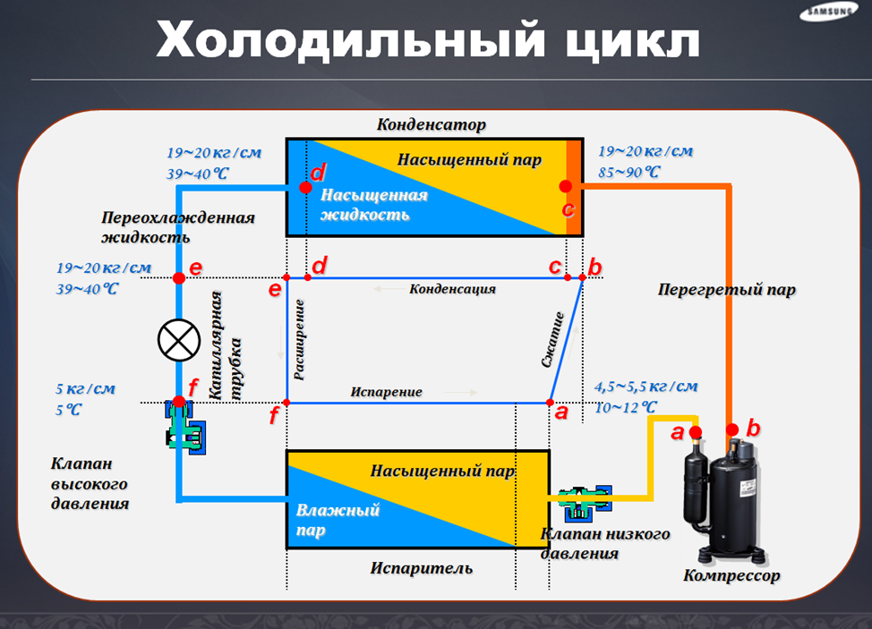 В процессе работы кондиционера происходит следующее. На вход компрессора из испарителя поступает газообразный фреон под низким давлением в 3...5 атмосфер и температурой 10...20 °С. Компрессор кондиционера сжимает хладагент до давления 15...25 атмосфер, в результате чего фреон нагревается до 70...90 °С, после чего поступает в конденсатор.