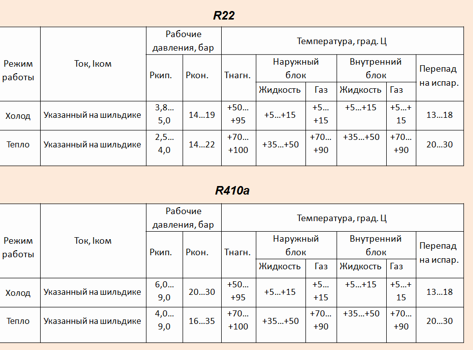 Диапазон рабочих температур и давления в зависимости от типа хладагента и режима работы