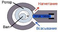 Принцип действия этого типа компрессора такой же как и у предыдущего, с той лишь разницей, что пластины находятся на роторе и вращаются вместе с ним. Подробней это видно рисунке, для упрощения показано всего две пластины.