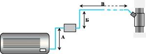 - высоту всасывания (разницу высот дренажной ванны и места установки насоса) (А); – высоту вертикального участка нагнетательного трубопровода (Б);